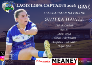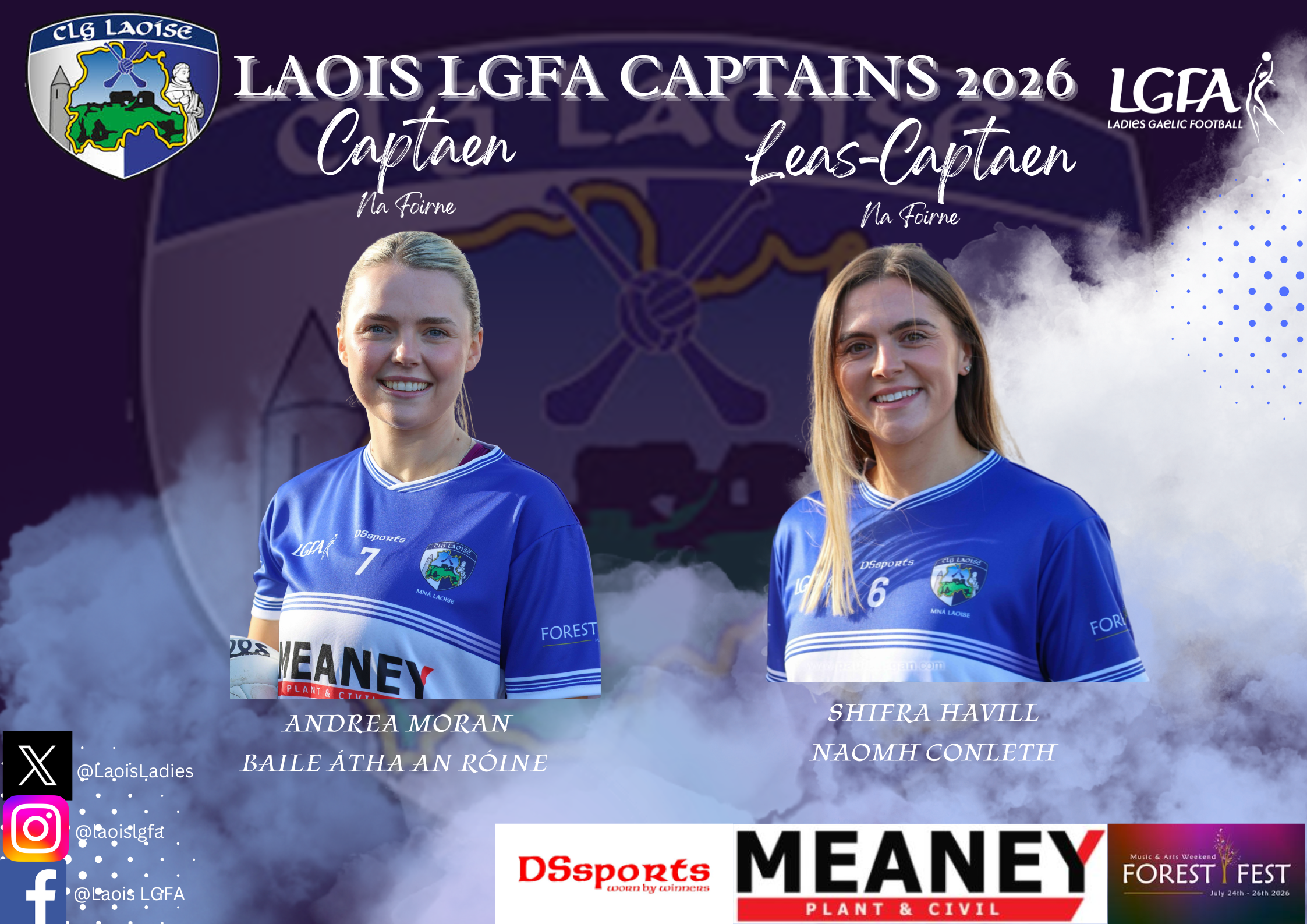 A huge congratulations to Andrea Moran of Ballyroan and Shifra Havill of St. Conleths who have been selected as the Intermediate Laois Ladies Captain and Vice Captain respectively.